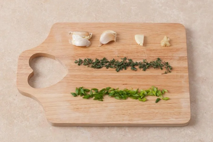 ШАГ 2 Раздавите и очистите чеснок, мелко нарежьте 0,5 зубчика чеснока, разотрите его до состояния пасты, мелко нарубите зеленый лук, отделите листочки тимьяна.