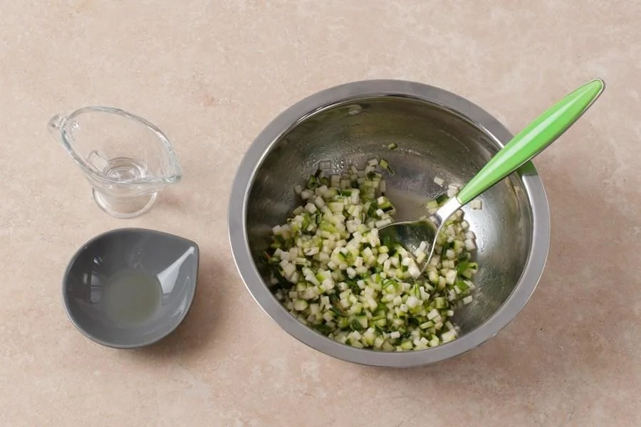 ШАГ 1 Поставьте 250 мл питьевой воды в морозилку; цукини нарежьте тонкими пластинами, пластины нарежьте соломкой, соломку нарежьте мелким кубиком, слегка подсолите и поперчите, добавьте щепотку сахара.
