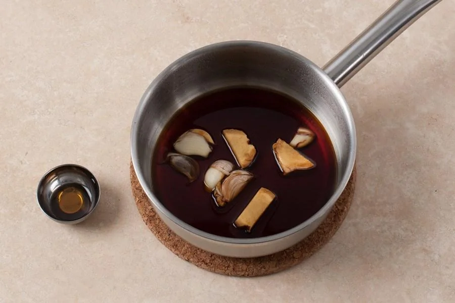ШАГ 4 В сотейник положите оставшийся чеснок, залейте соевый соус и сакэ, добавьте сахар и нарезанный пластинами по 0,5 см имбирь, доведите до кипения, снимите с огня и добавьте кунжутное масло.