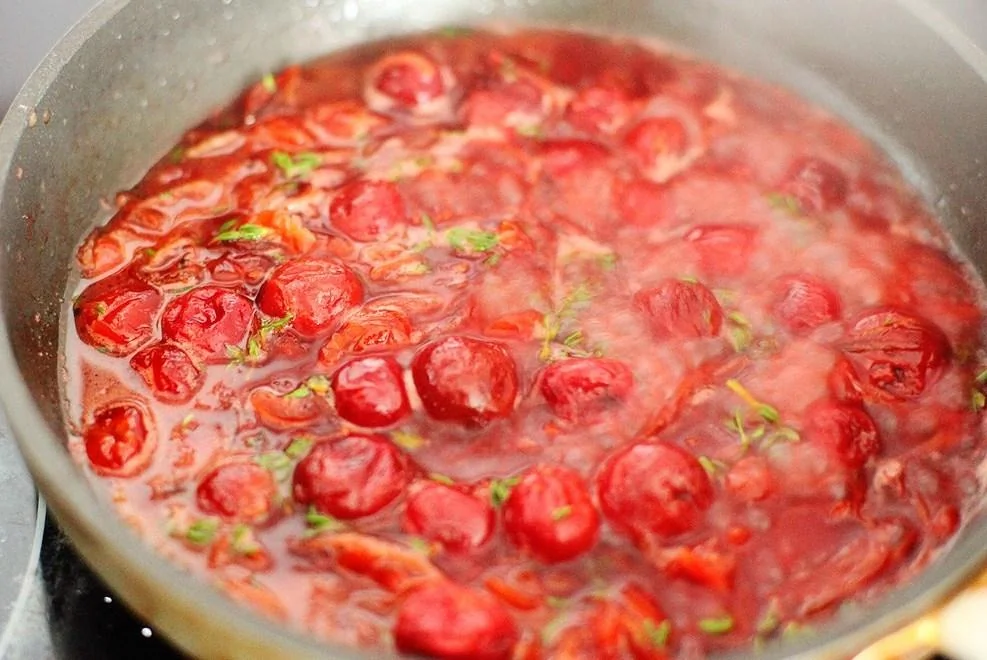 Добавьте сушеную вишню. Через 2 минуты влейте бульон, добавьте замороженную вишню. Готовьте, пока жидкость не выпарится наполовину (5–10 минут), затем добавьте листики тимьяна. Еще пара минут, и соус готов.