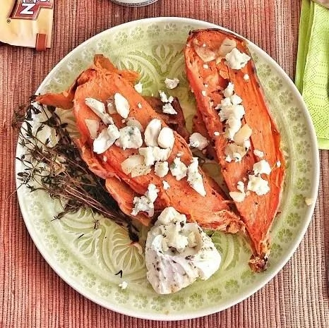 ШАГ 3 Достать из духовки. Голубой сыр размять руками и посыпать батат (не жалейте сыра). Подавать с веточкой тимьяна для аромата, также можно посыпать миндальной крошкой.