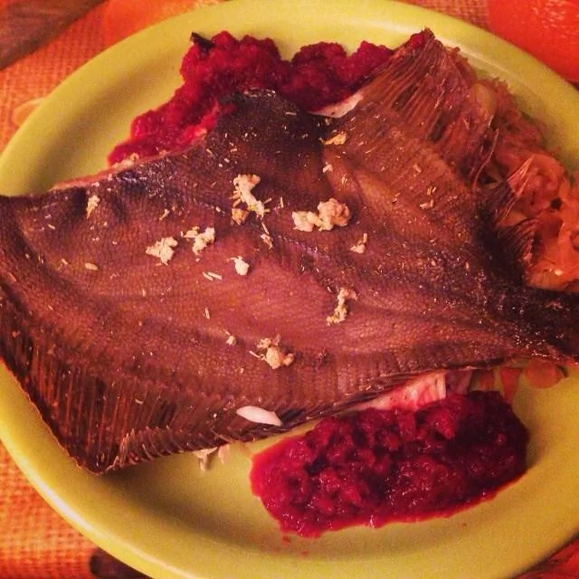 ШАГ 4 Подавать камбалу с томленой капустой, пореем и свекольным соусом.