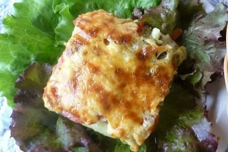 ШАГ 3 В миске взбить миксером яйца и сметану. Добавить к сметано-яичной смеси тертый на мелкой терке сыр и перемешать все хорошо. Полить полученной смесью запеканку, накрыть фольгой и запекать 15 минут.