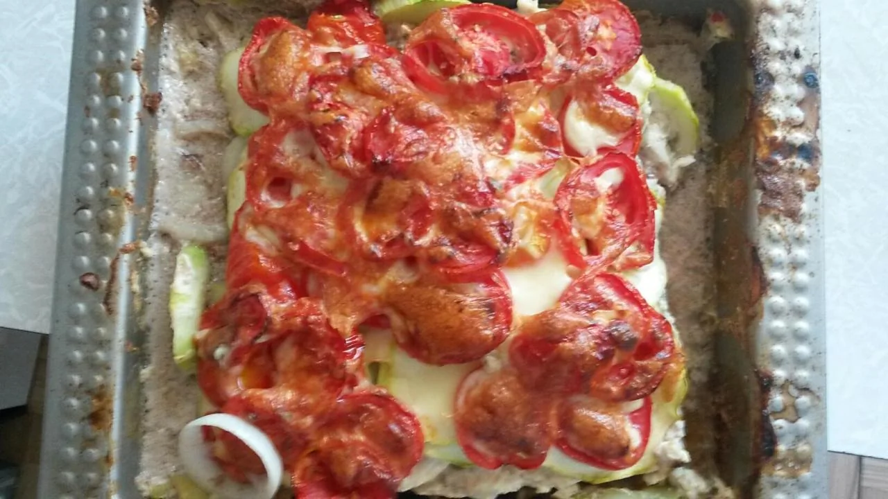 ШАГ 2 Уложить на смазанный противень слой кабачков, слой фарша, лук колечками, опять слой кабачков, кружочки помидоров.