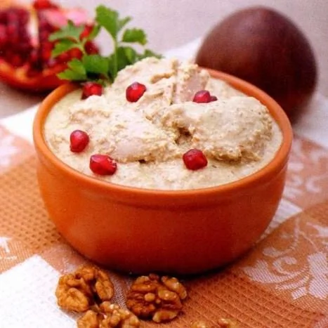ШАГ 4 Получившуюся ореховую массу развести горячим бульоном до консистенции густой сметаны. Этим соусом сразу залить куски птицы.