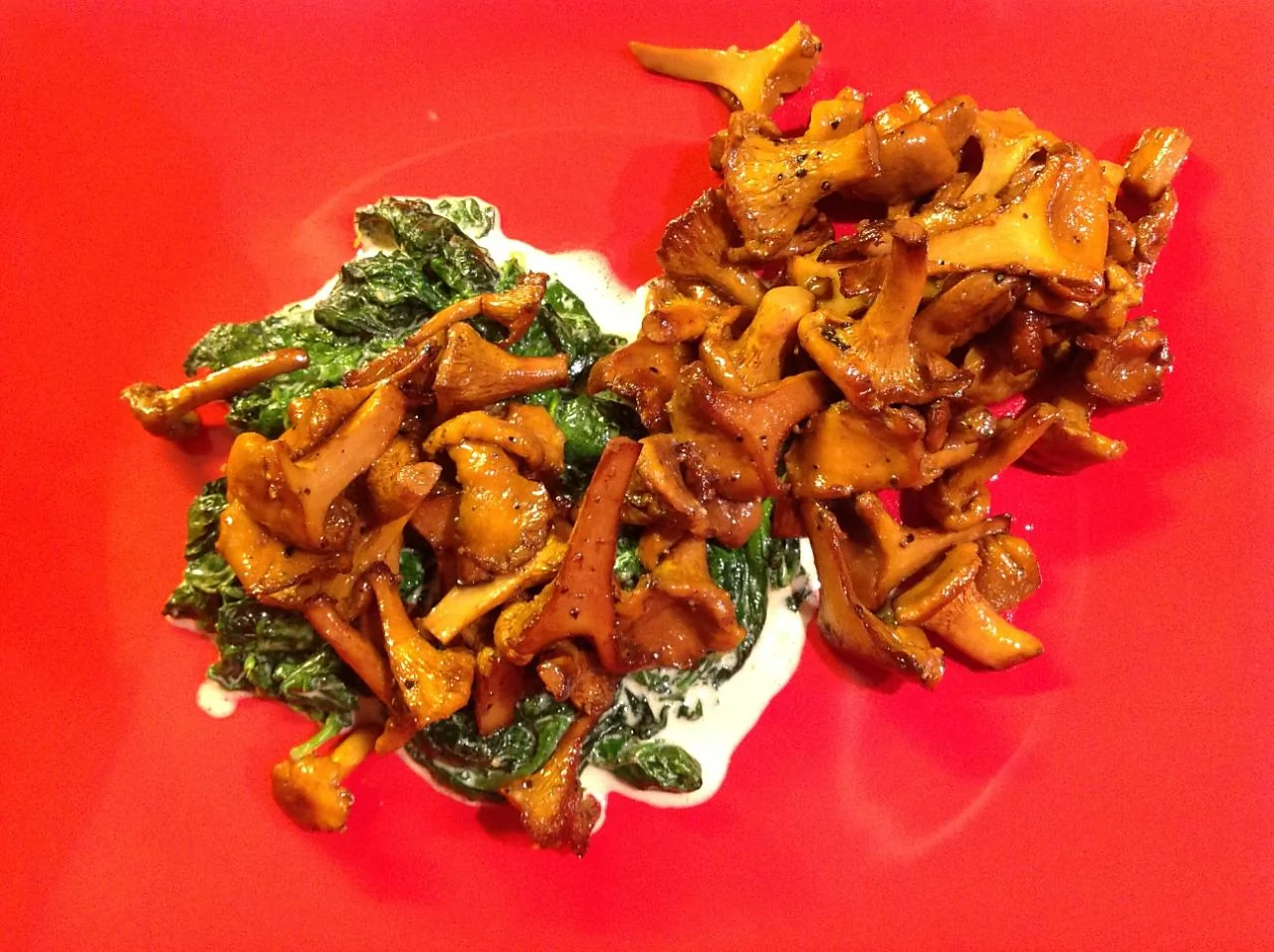 ШАГ 5 Вуаля! Выложить на тарелку шпинат, полить сверху «соусом» из сливок, который остался в сковороде, сверху выложить лисички.