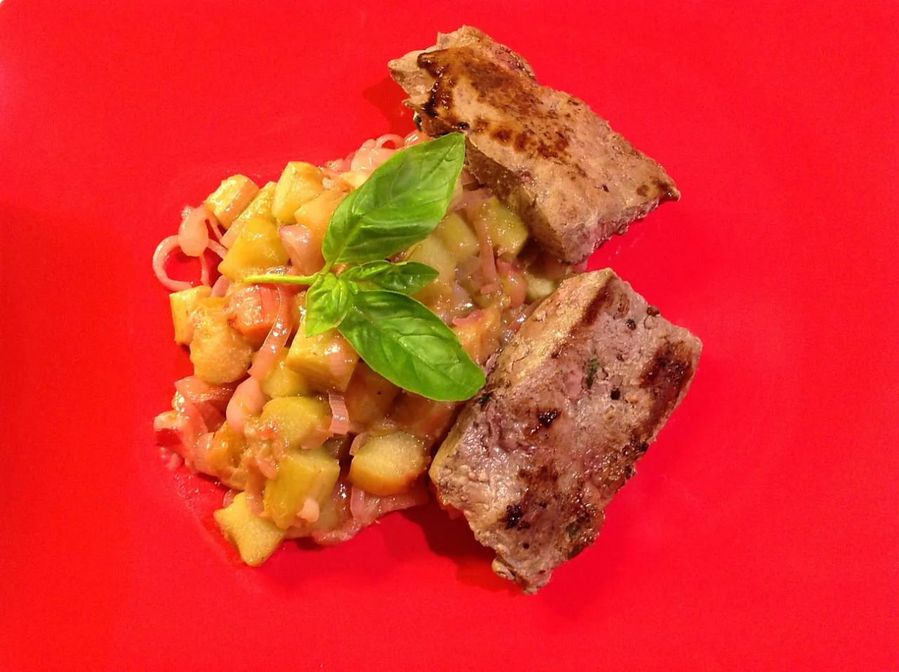 ШАГ 4 Вуаля! Выложить на тарелку ревень и печень, украсить листиками базилика.