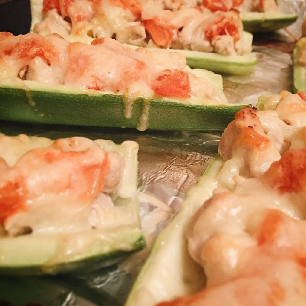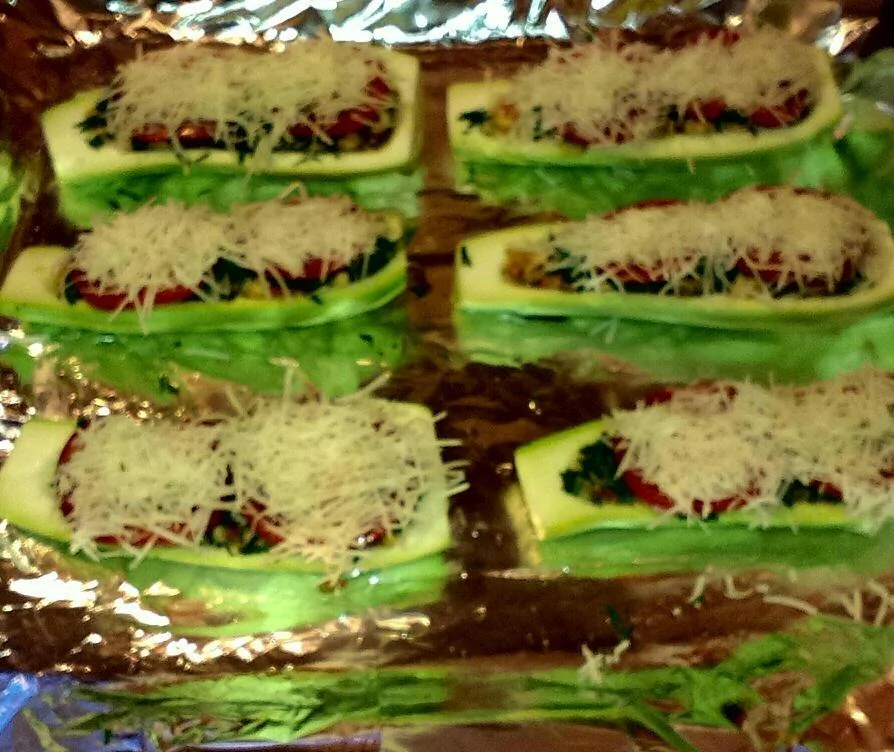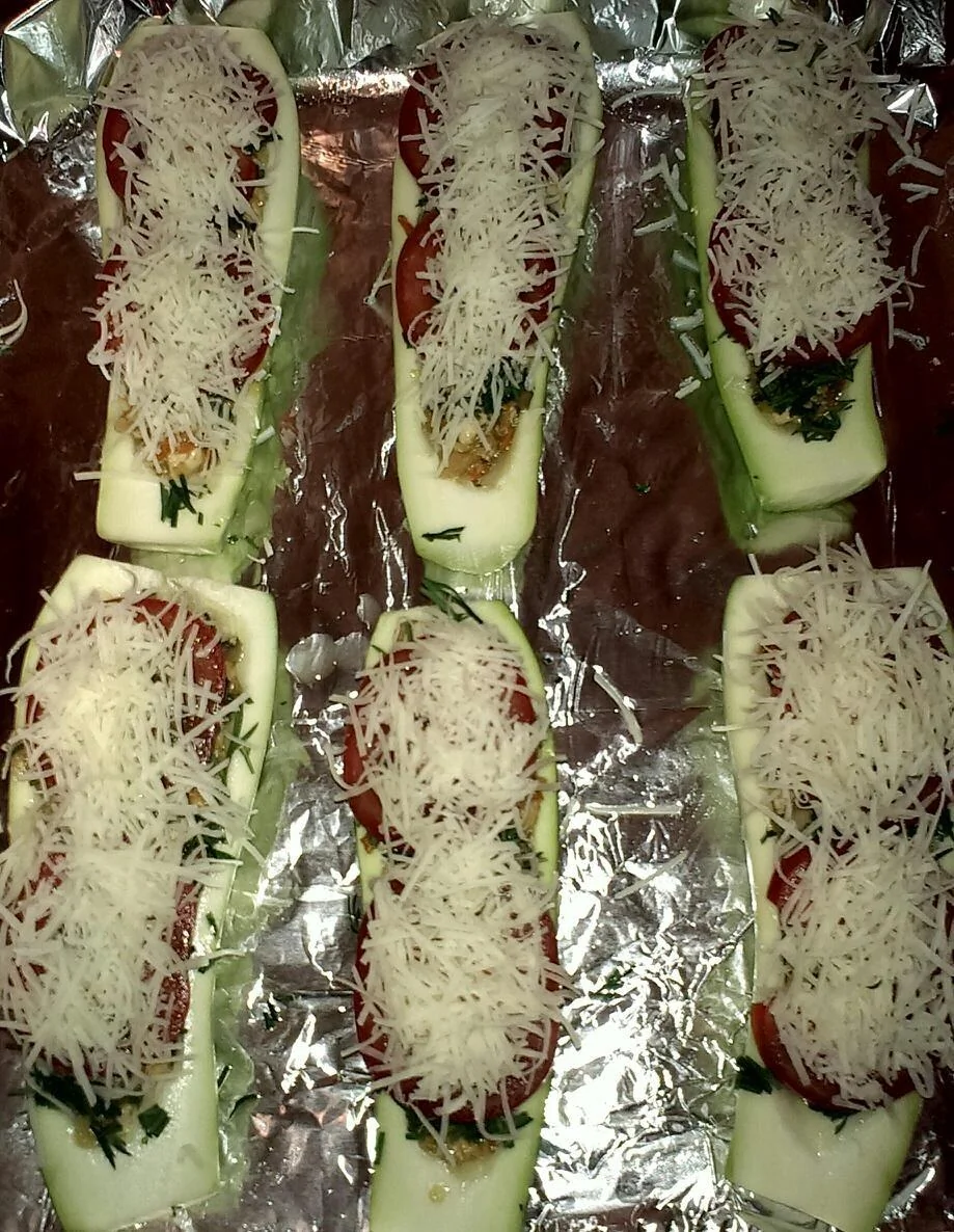 ШАГ 4 Выложить начинку внутрь кабачков, сверху положить кружочки помидора, посыпать натертым сыром пармезан (или любым другим) и запекать в духовке при температуре 180 градусов 15–20 минут.