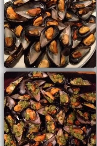 ШАГ 1 Если у вас мидии закрытые, кладем их на противень в духовой шкаф, при 200 градусах примерно минут на 5. Через несколько минут они откроются и можно будет приступить к рецепту.