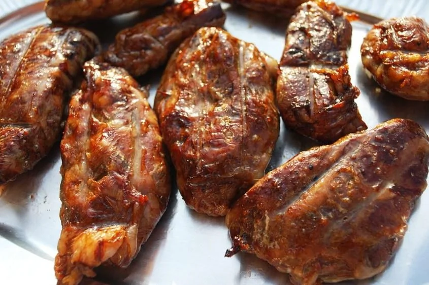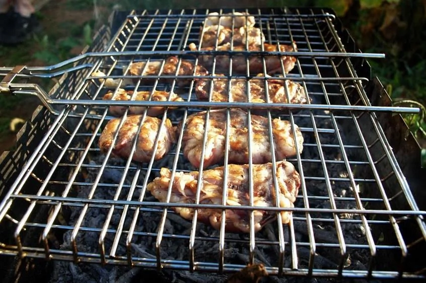 ШАГ 6 Выложить кусочки на решетку. Вишневые угли для печени барана подойдут лучше всего. Переворачивать решетку каждые 2–3 минуты.