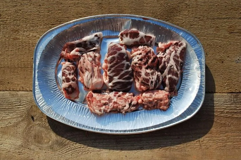 ШАГ 4 Нарезать жировую сетку на кусочки, достаточные по размеру, чтобы обернуть куски печени.