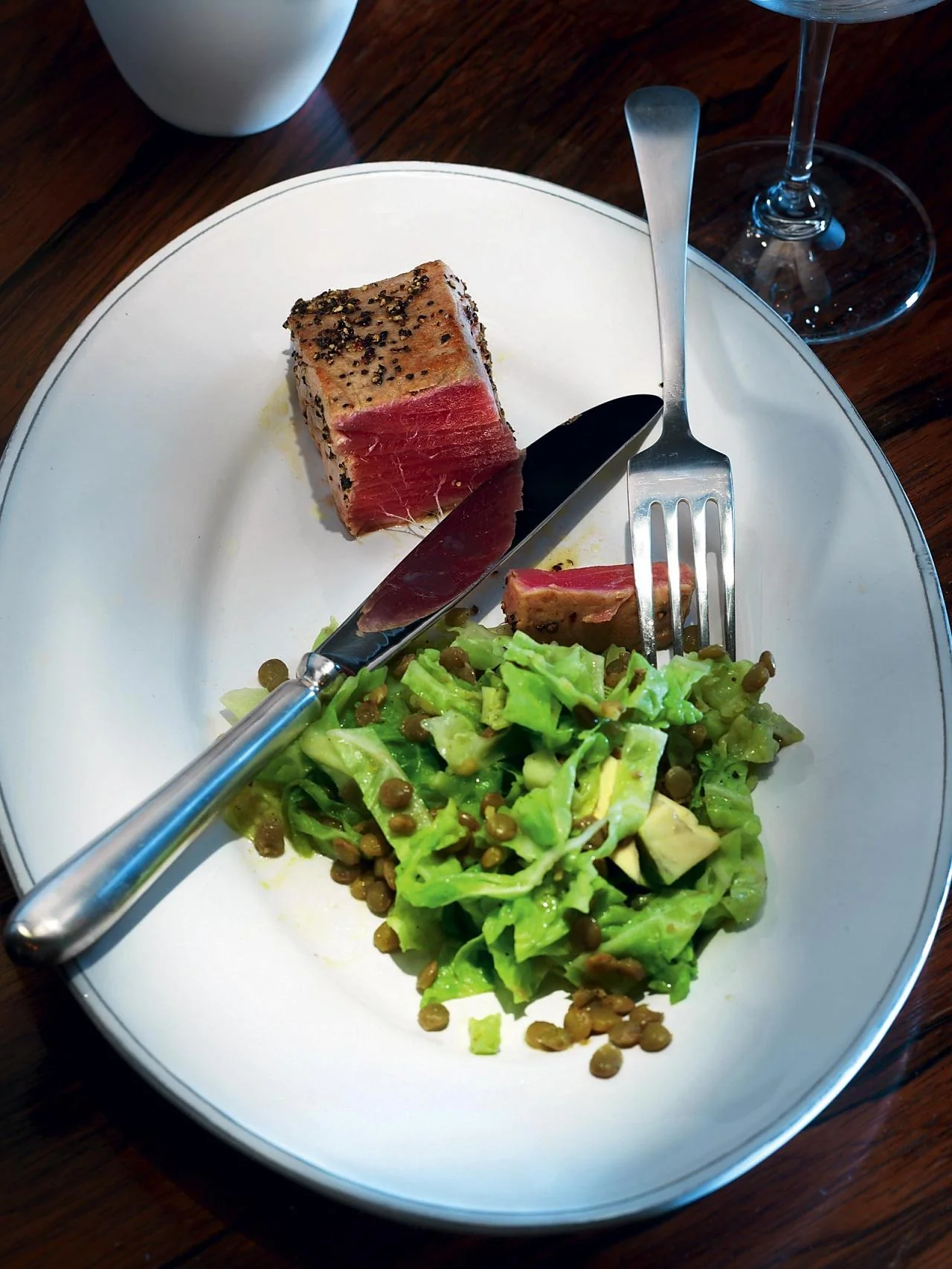 ШАГ 7 Подавать тунца с салатом из чечевицы, савойской капусты и авокадо.