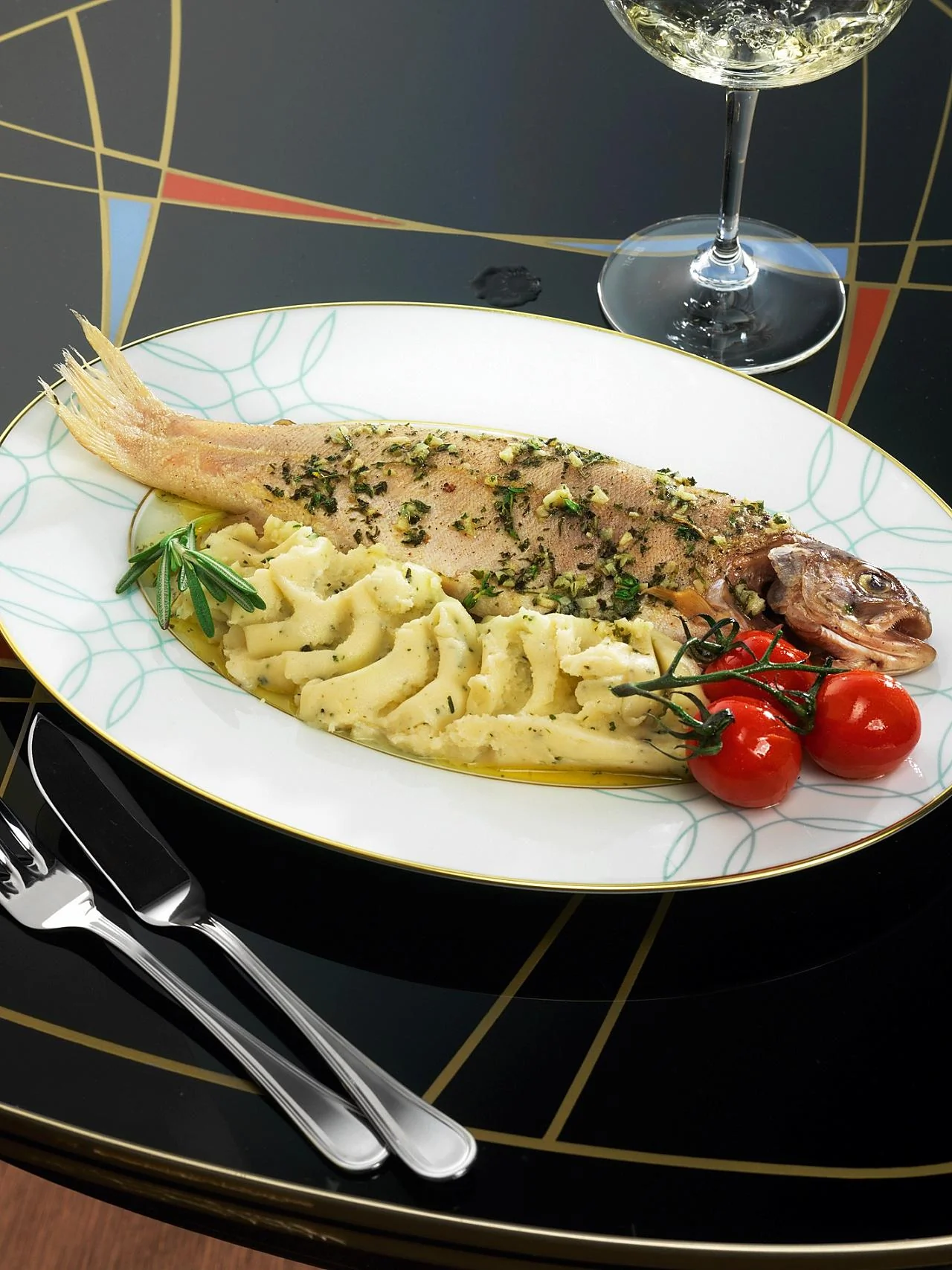 ШАГ 7 Готовую рыбу выложить на блюдо, полить теплым чесночным маслом, выложить рядом пюре и украсить веткой черри.