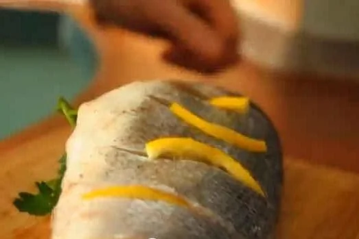ШАГ 3 Затем взять рыбу, удалить чешую и выпотрошить. Сделать 5–6 надреза поперек тушки прям до самого хребта с обеих сторон, посолить и поперчить с обеих сторон и внутри.