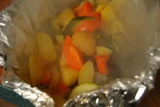 ШАГ 6 Сверху положить сливочное масло, запечатать конверт, оставляя много пространства и небольшое горлышко сбоку, куда влить 70 мл белого вина (сладкое, полусладкое или сухое). Запечатать горлышко и поставить в заранее разогретую до 200–220 градусов духовку на 20 минут.