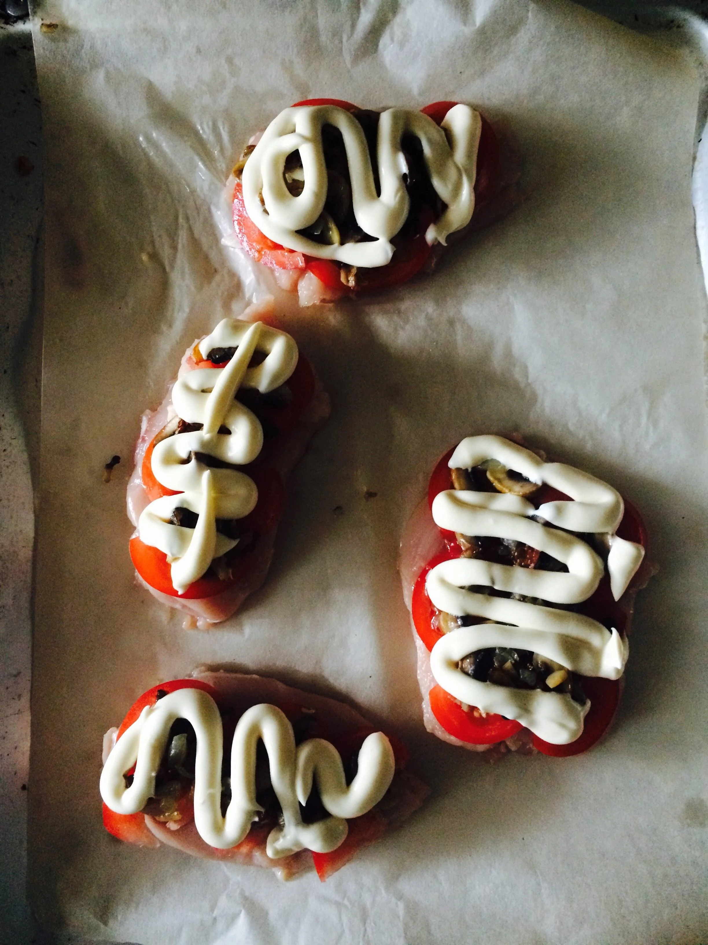 ШАГ 2 Разогрейте духовку до 180 градусов. Курицу выложите в противень, сверху — нарезанные кружками помидоры, следующим слоем — грибы. Сверху помажьте майонезом и посыпьте сыром. Запекайте в течение 25 минут.