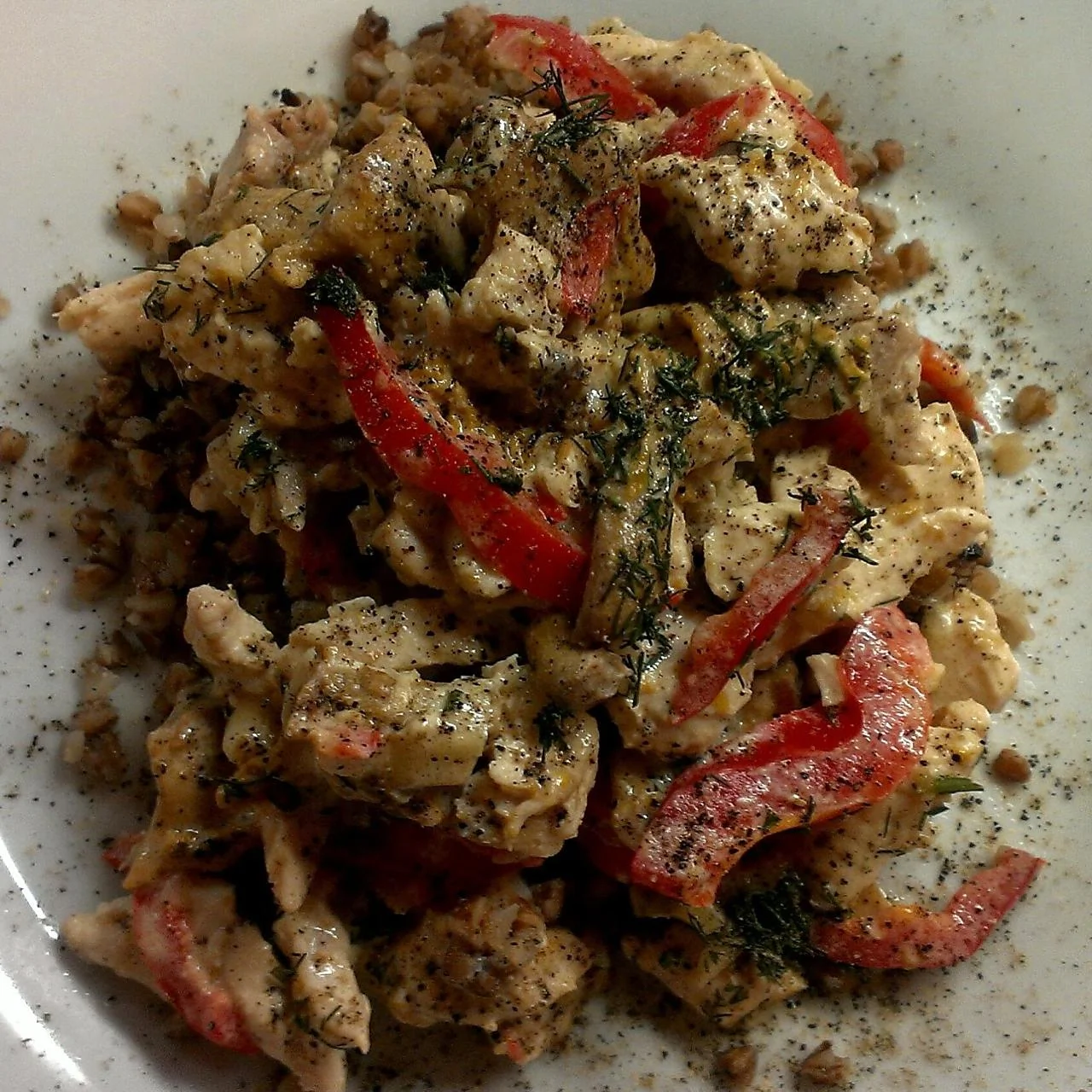 ШАГ 5 В одной сковороде пожарить на растительном масле курицу. В другой обжарить лук и грибы. Минут через добавить к курице грибы и лук, и жарить все вместе 5 минут. Затем добавить болгарский перец, посолить, поперчить. Жарить еще 3 минуты.