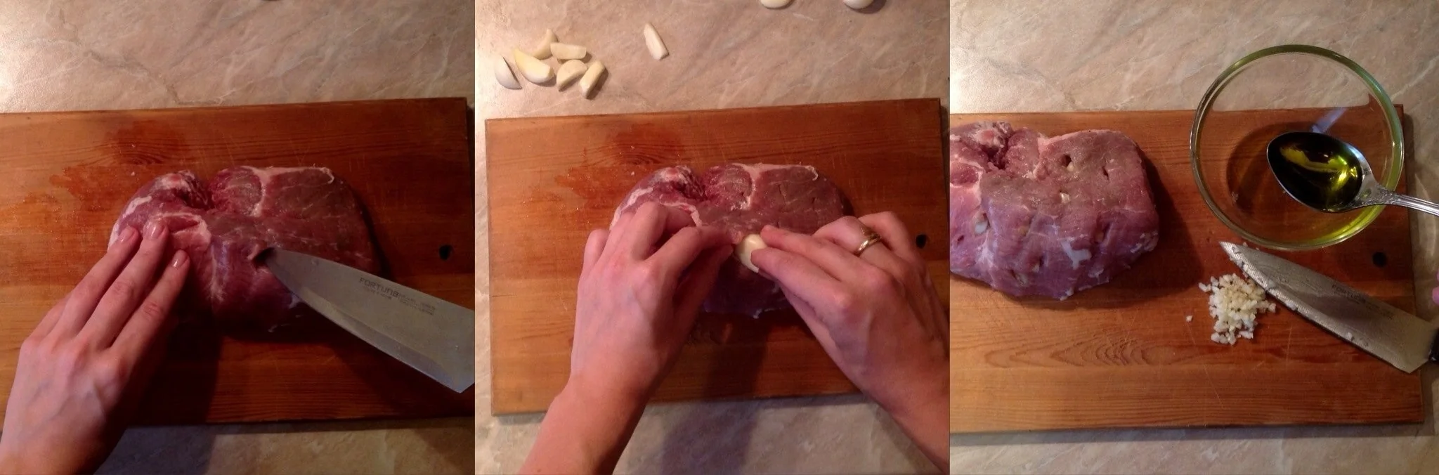 ШАГ 1 Делаем в мясе неглубокие надрезы и вставляем в полученные отверстия очищенный чеснок, при необходимости зубчик можно разрезать на несколько частей.