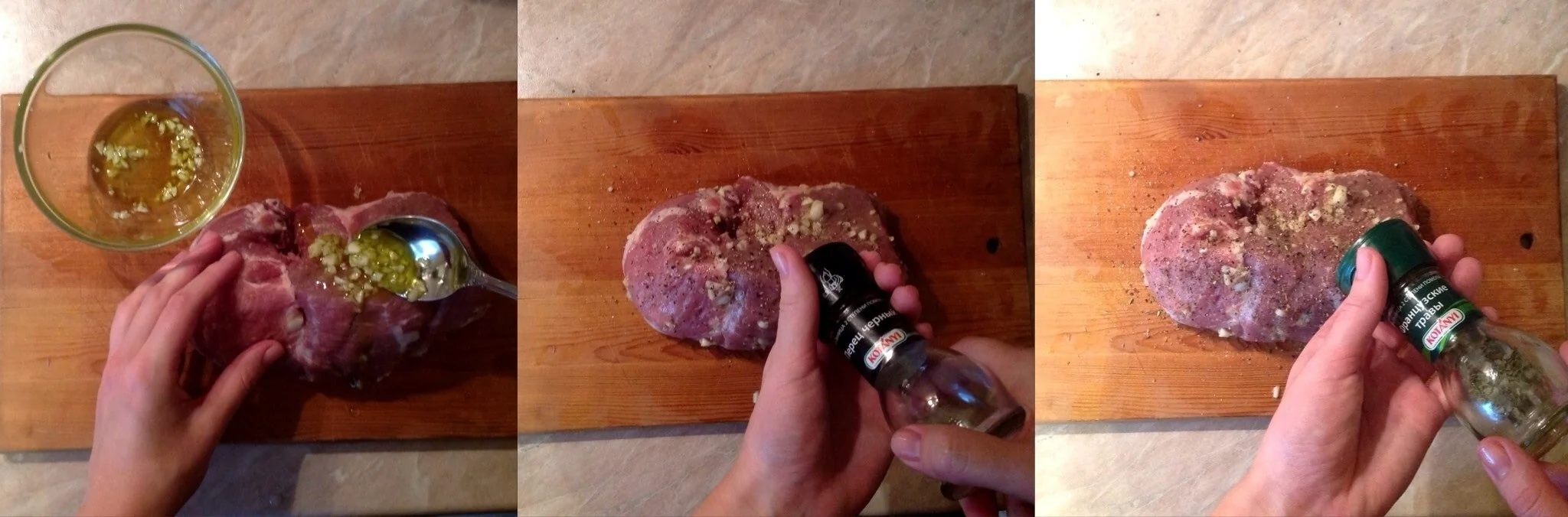ШАГ 2 Смазываем мясо оливковым маслом. Если вы любите чеснок, также как и я, то советую к маслу добавить мелко нарубленный чеснок и этой смесью натереть мясо.