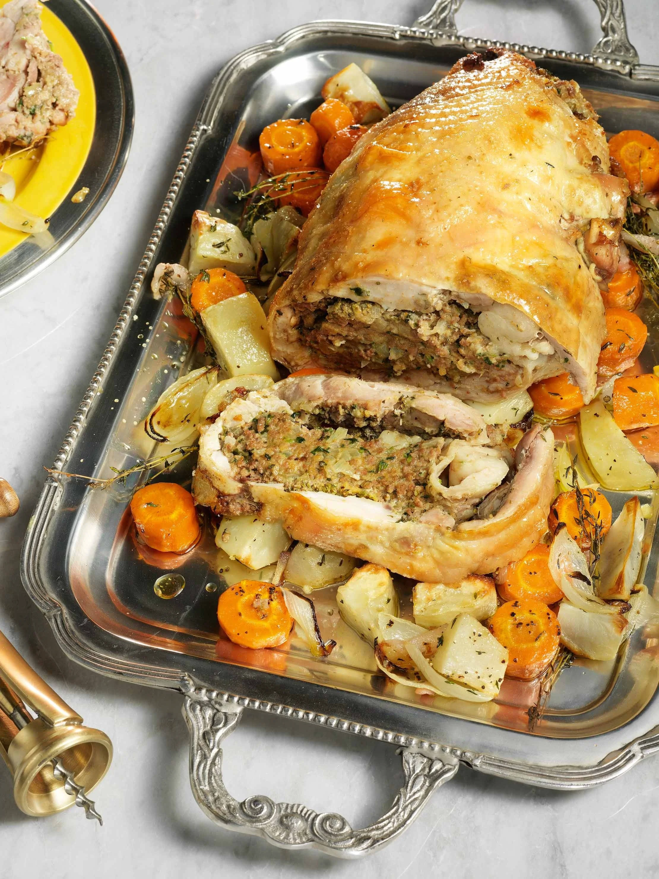 ШАГ 3 Через час выложить на противень нарезанные крупными кусками морковь, лук и картошку, посыпать тимьяном, полить соком из-под индейки и запекать еще сорок минут.