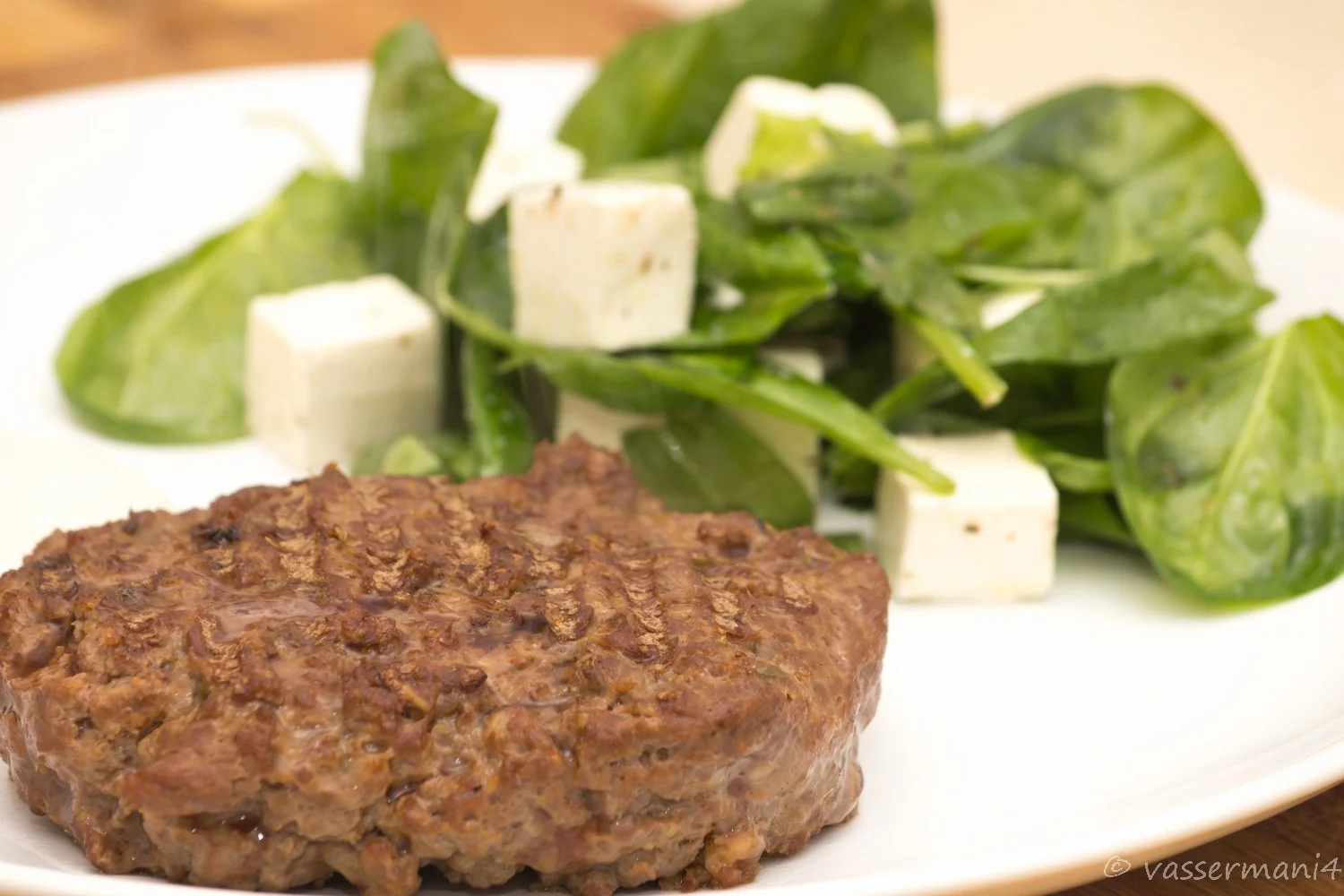 Рубленный бифштекс с соусом блю-чиз и салатом из шпината и сыра фета