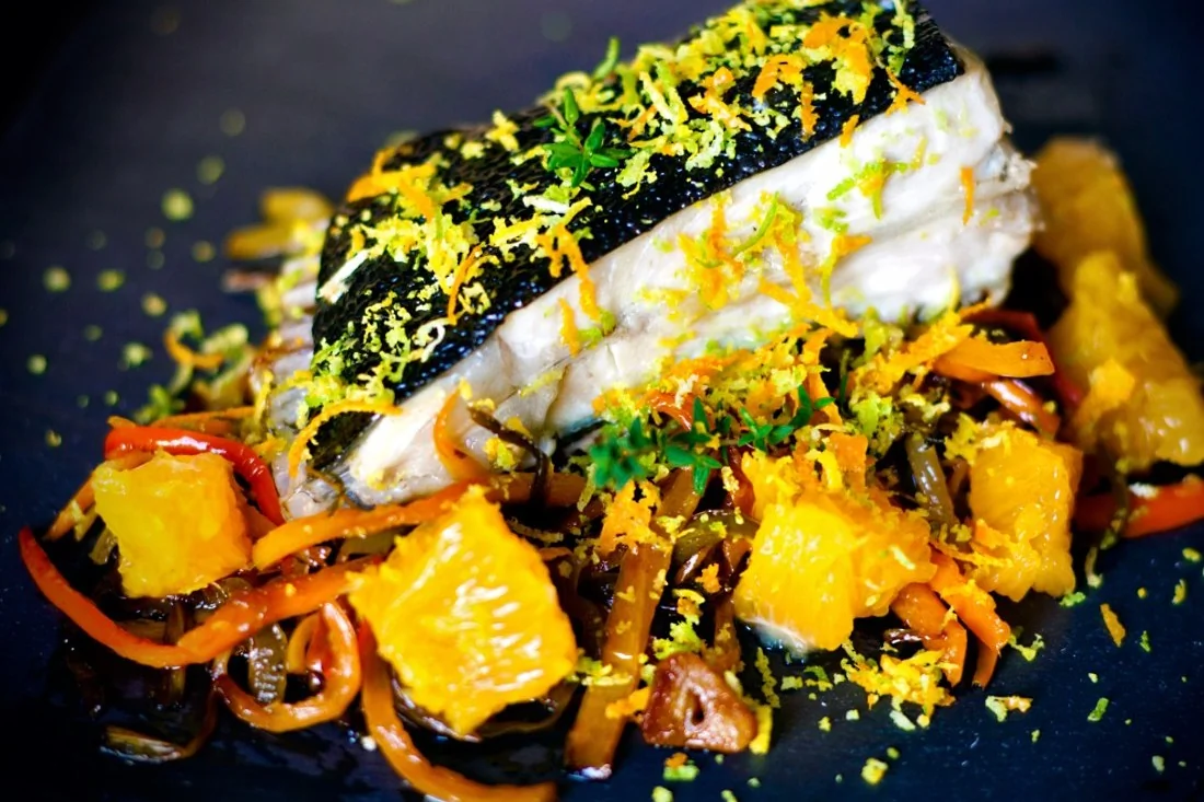 Тюрбо, запеченная в духовке, с перцами и апельсинами