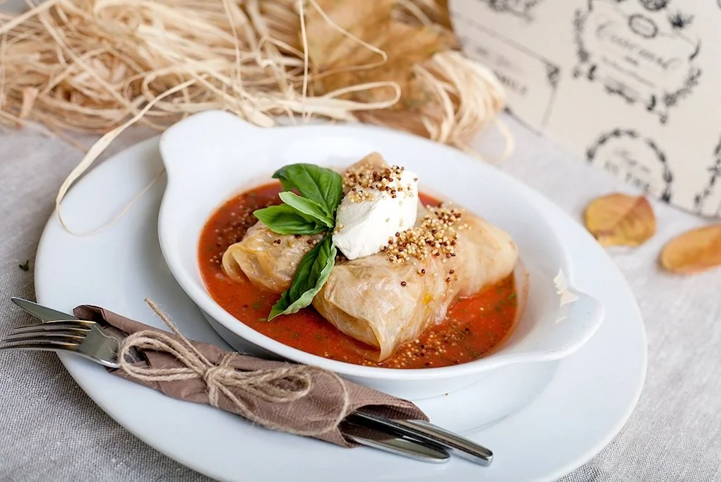 ШАГ 5 После приготовления голубцов выливаем томатный сок и добавляем в него мелко нарезанную зелень. Выкладываем голубцы на тарелку, сверху поливаем томатным соусом, посыпаем киноа и кладем сверху сыр филадельфия. Украшаем листиком базилика.