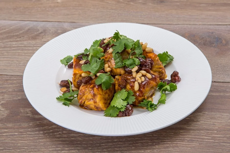 ШАГ 6 Полейте рыбу соусом с изюмом, присыпьте кедровыми орешками.