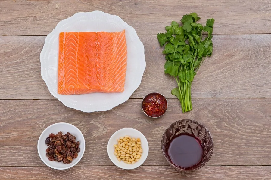 Ингредиенты для приготовления Лосось с шафраном и кедровыми орешками: