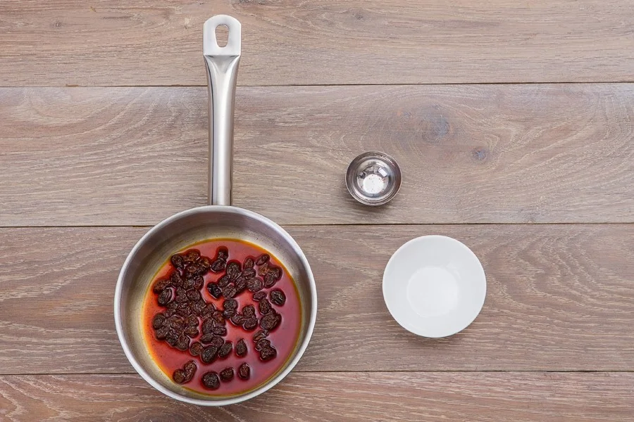 ШАГ 2 Доведите до кипения половину портвейна в небольшой кастрюле, снимите с огня, добавьте изюм и шафран, перемешайте и оставьте мариноваться на 5 минут.