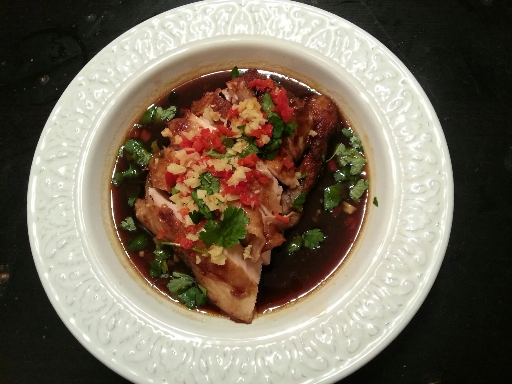 ШАГ 4 Срезать филе с кости, нарезать ломтиками, посыпать мелко нарубленными имбирем, кинзой и перцем чили и подавать с уваренным соусом.