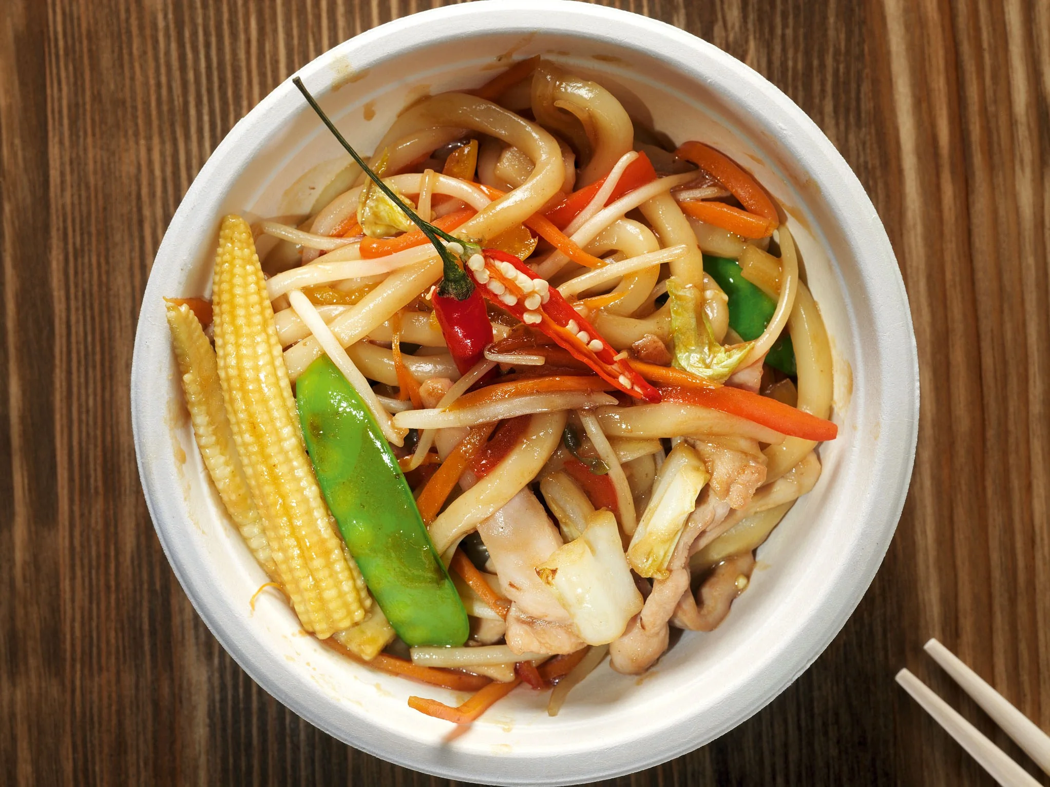 ШАГ 1 Сварить лапшу удон до готовности, следуя инструкции на упаковке, откинуть на дуршлаг и отставить в сторону. Фасоль, перец и кукурузу нарезать крупной соломкой, листья пак-чоя разрезать вдоль.