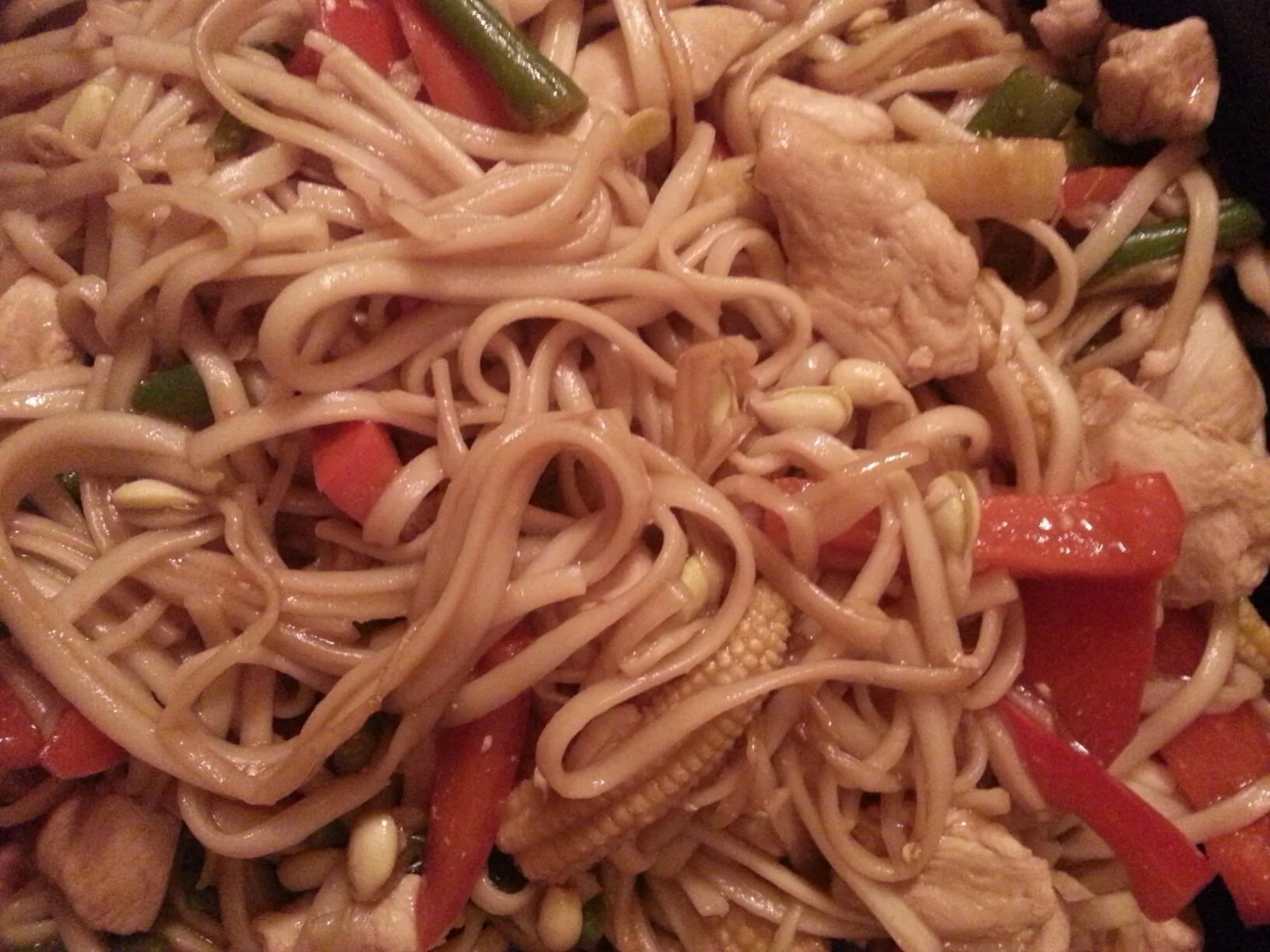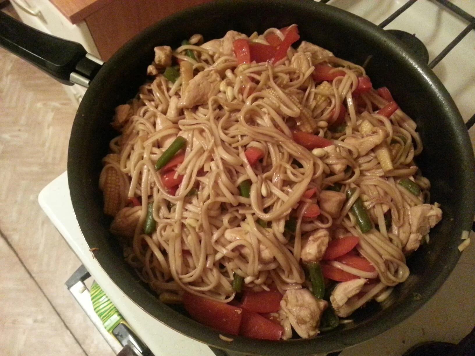 ШАГ 3 Добавить к курице и овощам готовую лапшу, перемешать и теперь уже положить в сковороду пак-чой. Влить устричный соус, снова аккуратно перемешать, стараясь не превратить все в кашу, и затем добавить соевый. Подавать сразу же.