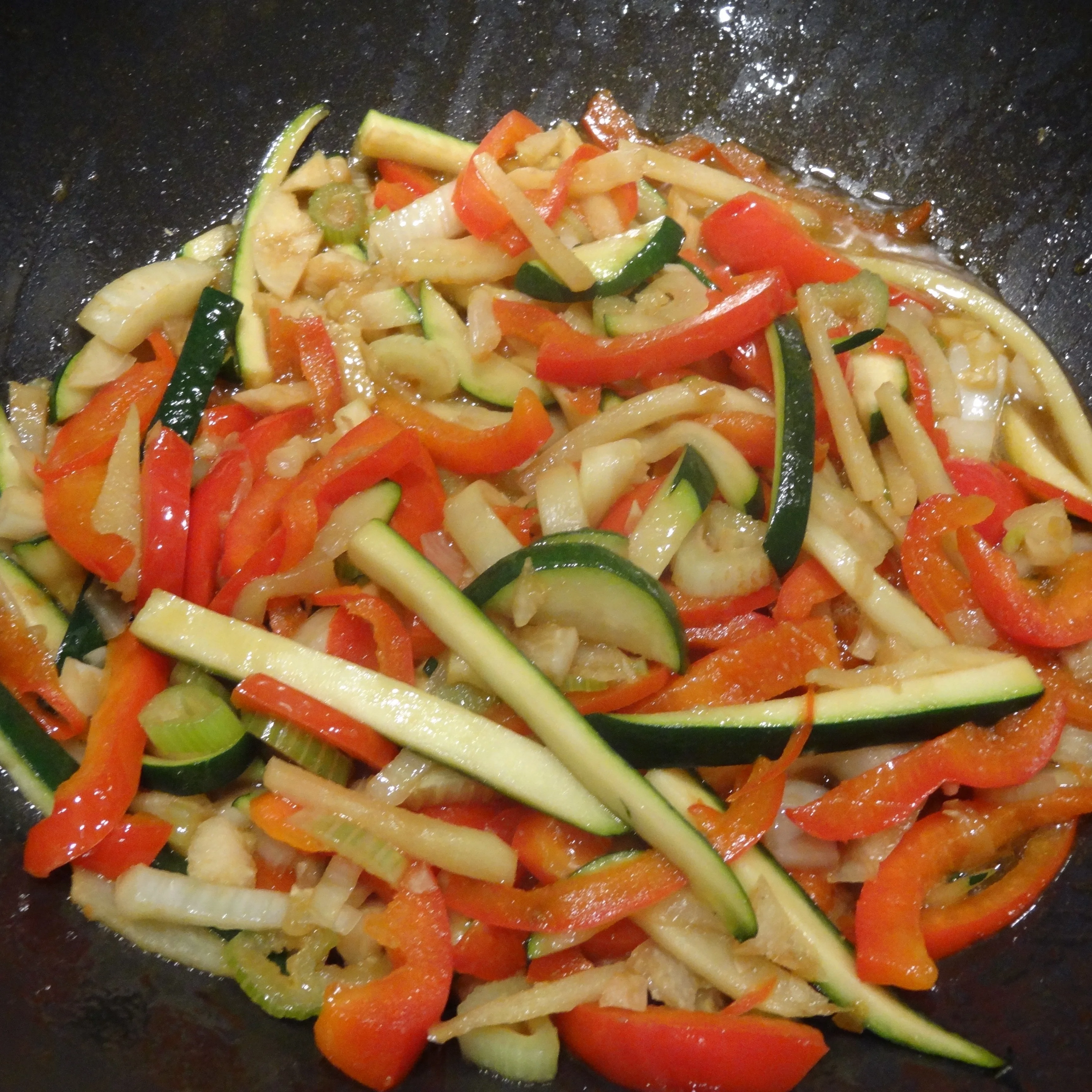ШАГ 8 Добавьте фенхель, перец и цукини. Обжаривайте, постоянно помешивая, около 3 минут. Через 2 минуты добавьте соус терияки.
