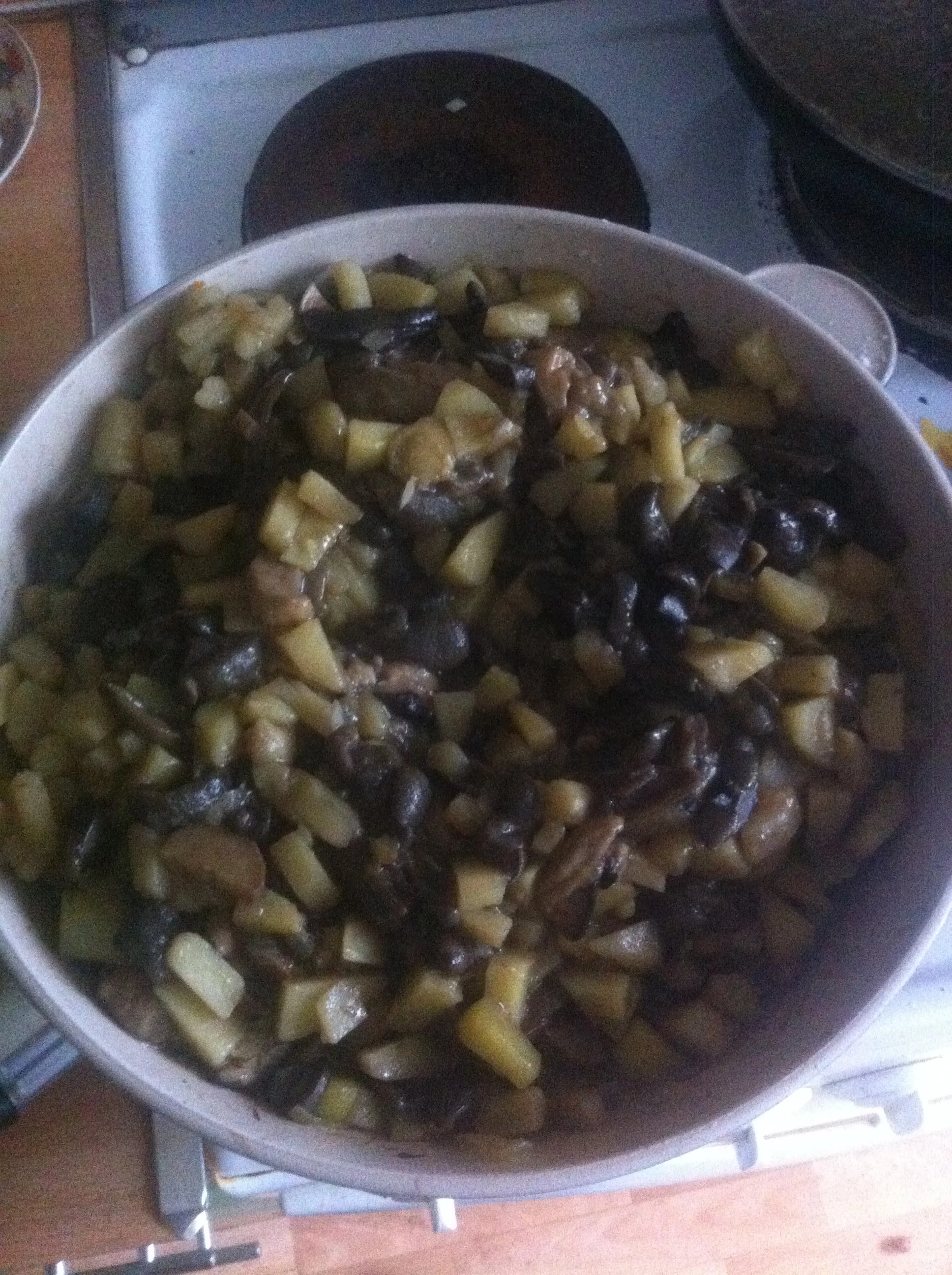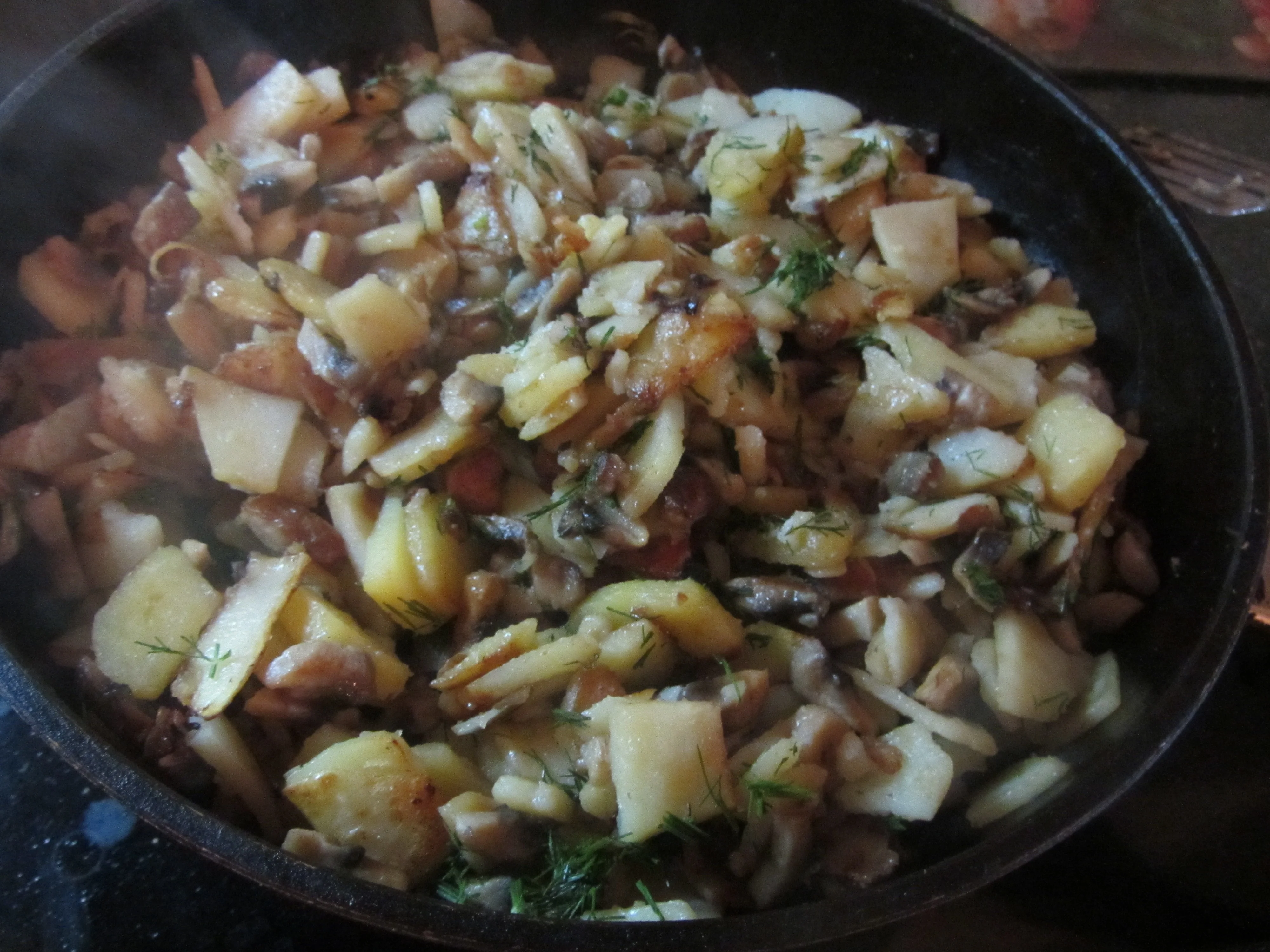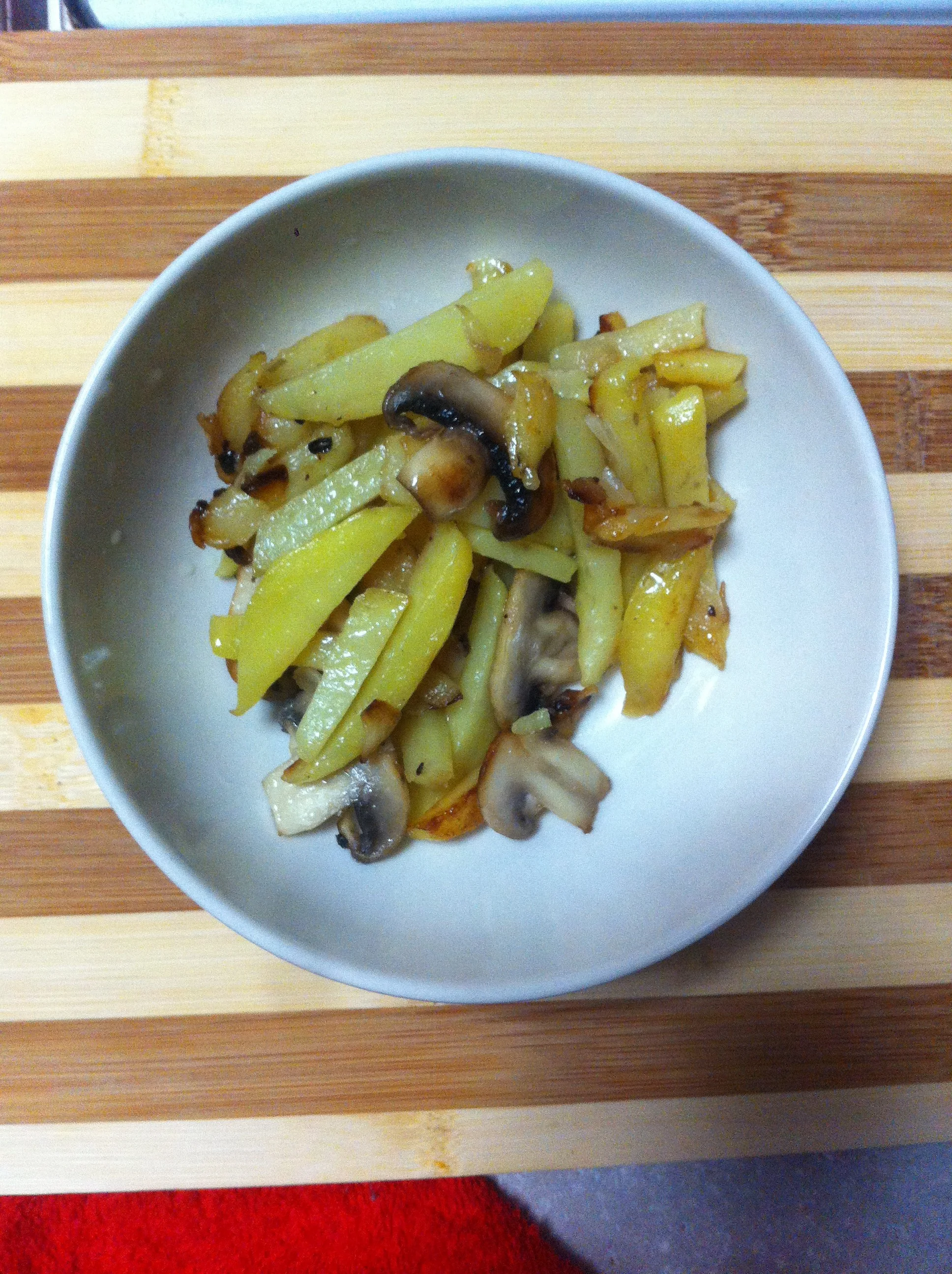 ШАГ 4 Нарезать шампиньоны пластинками, обжарить на отдельной сковороде в течение 5 минут. Добавить к картошке с луком, посолить, поперчить и подавать.