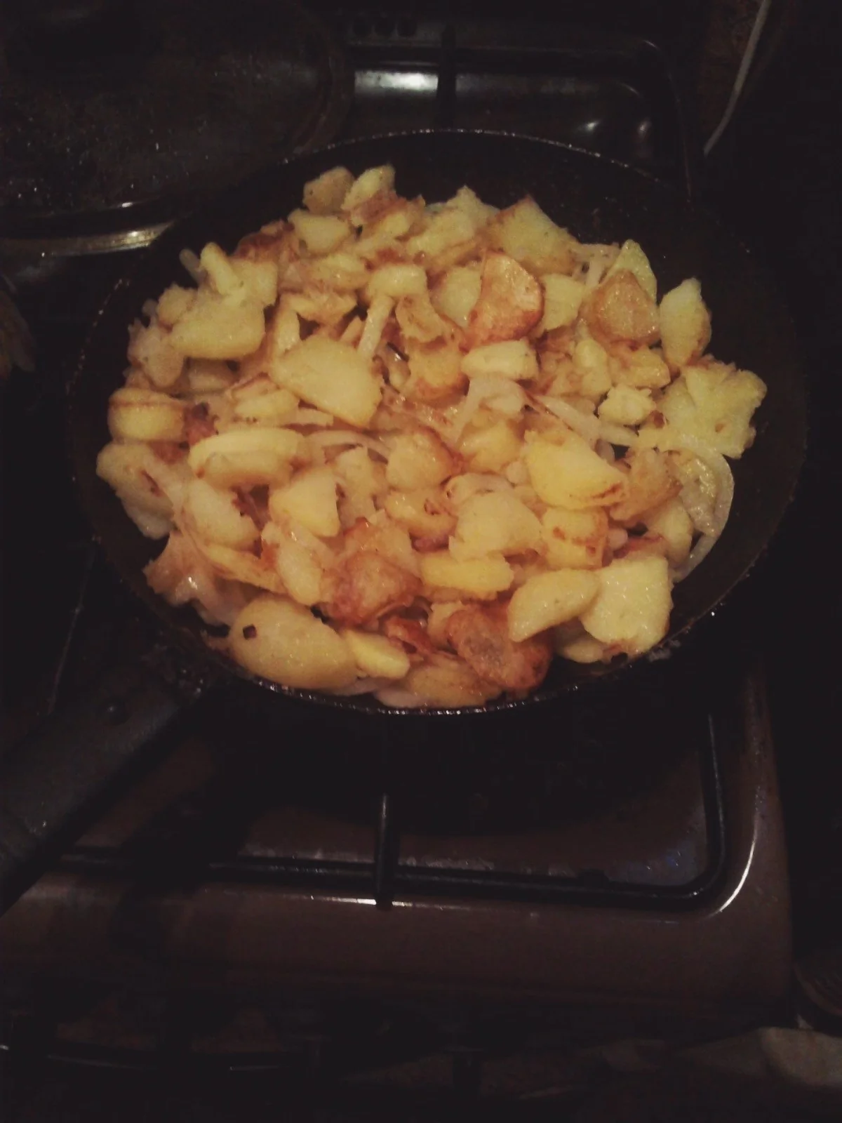 ШАГ 3 Нарезать лук кубиками, обжарить на отдельной сковороде до золотистого цвета, добавить к картошке и жарить еще минут 10.