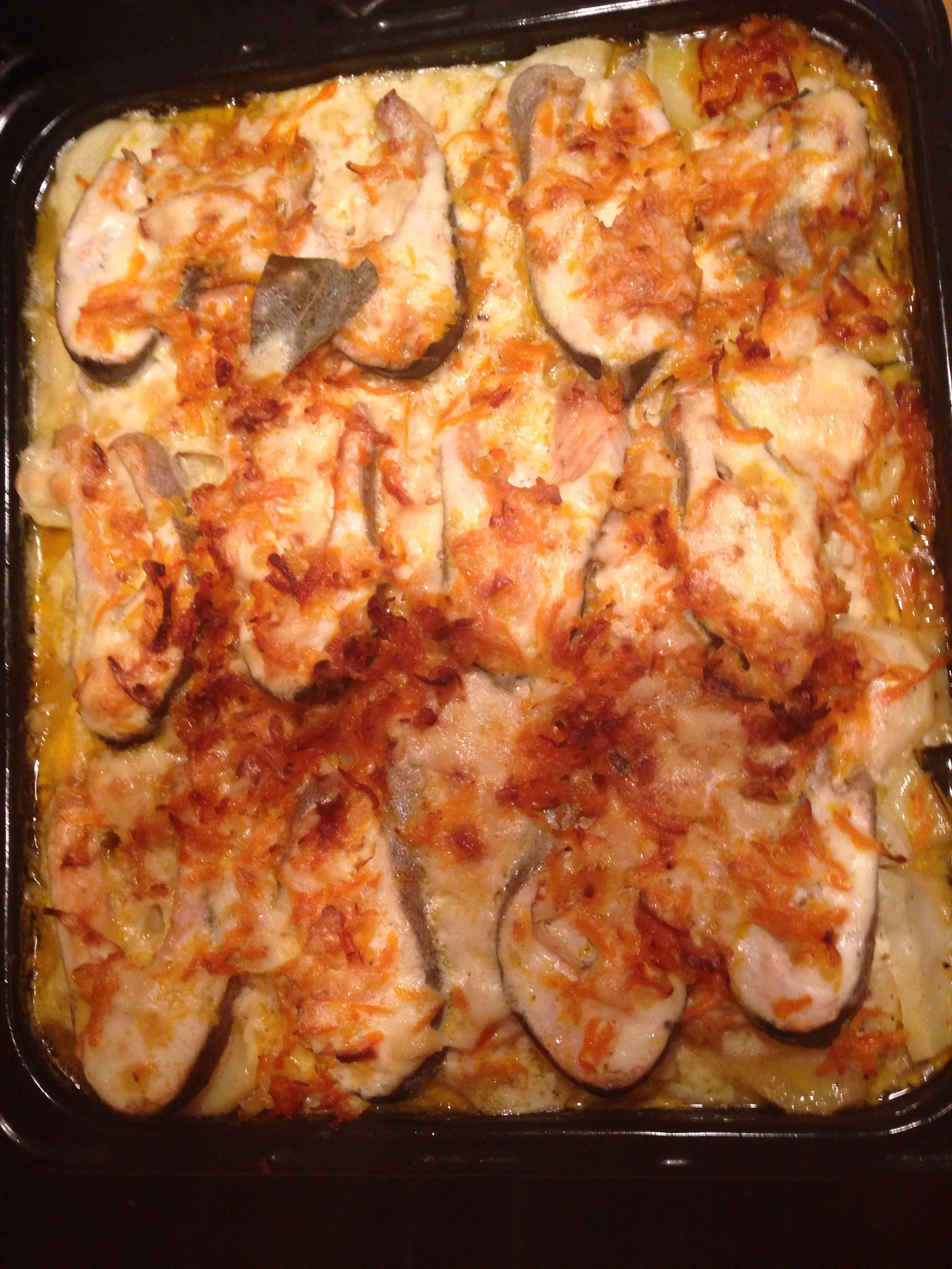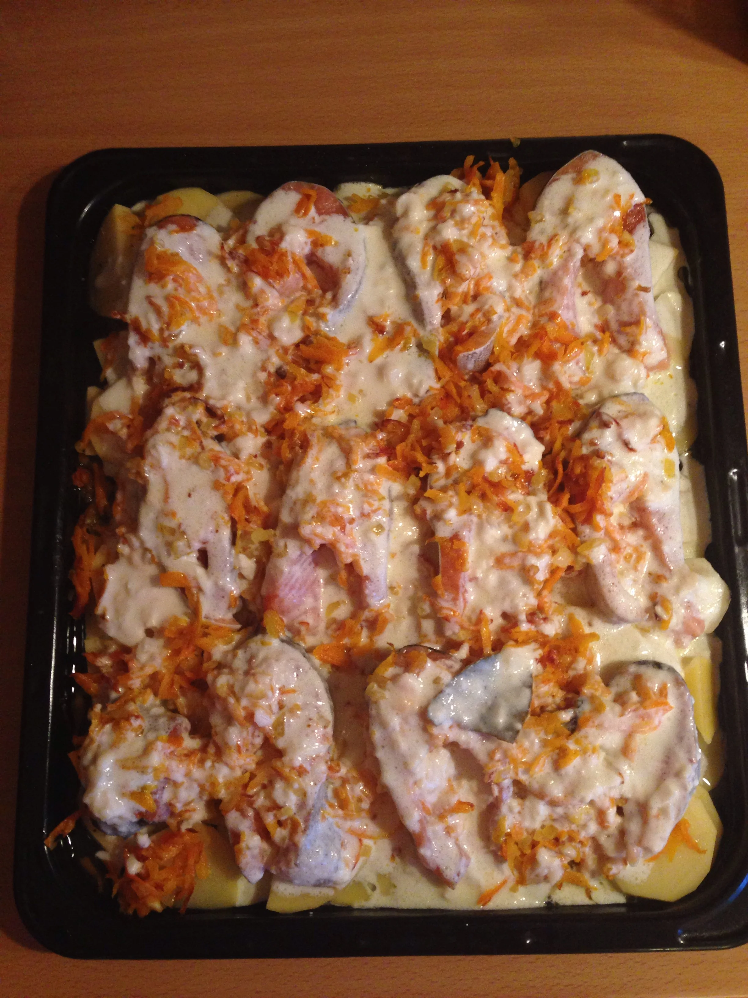 ШАГ 2 Картофель нарезаем кружочками средней толщины. Укладываем в форму, добавляем соль, перец и немного растительного масла. Сверху на картошку выкладываем рыбу, слегка присолив ее, на рыбу — морковь с луком и сверху выкладываем чесночный соус.