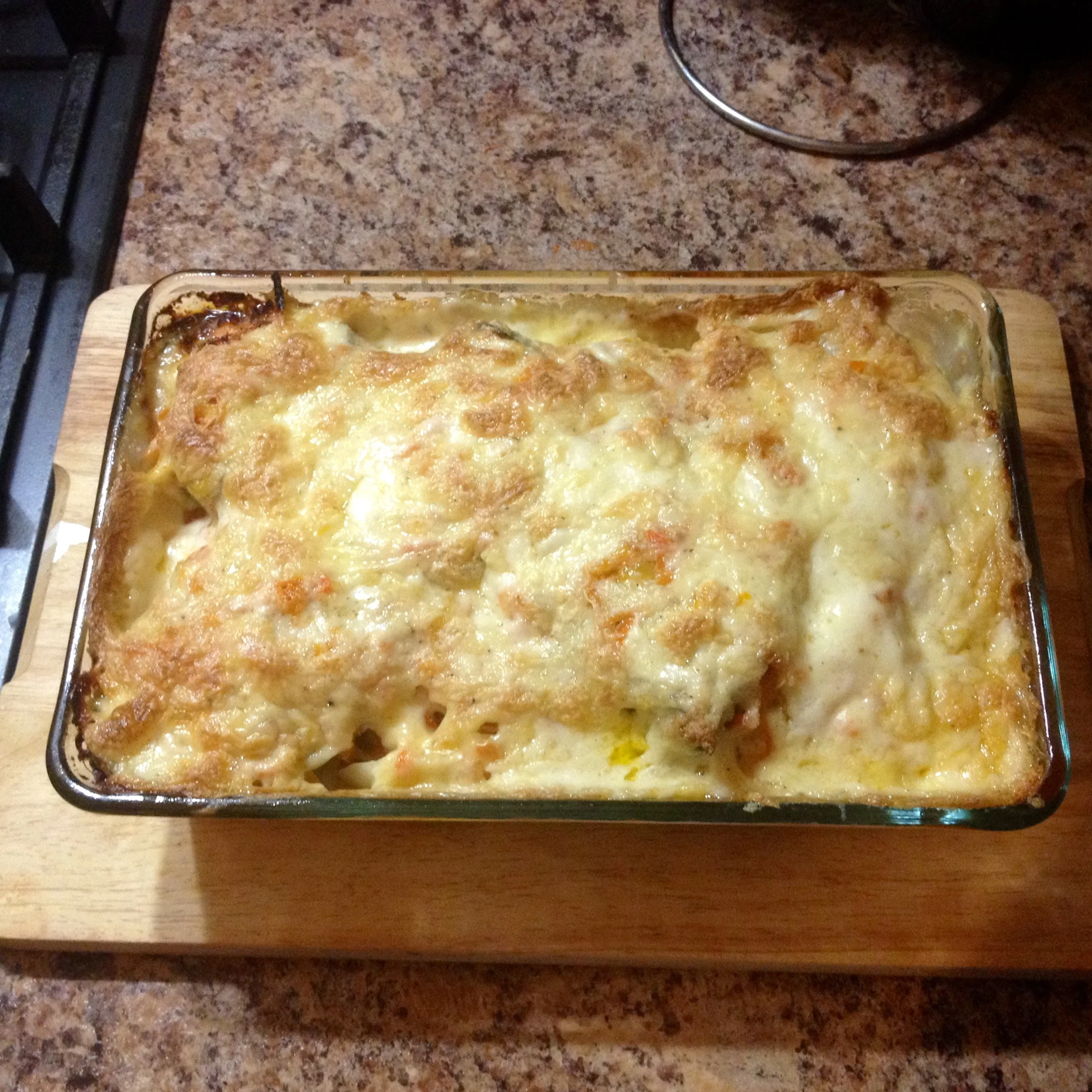 Форель под сливочно-чесночным соусом, запеченная на картофельной подушке
