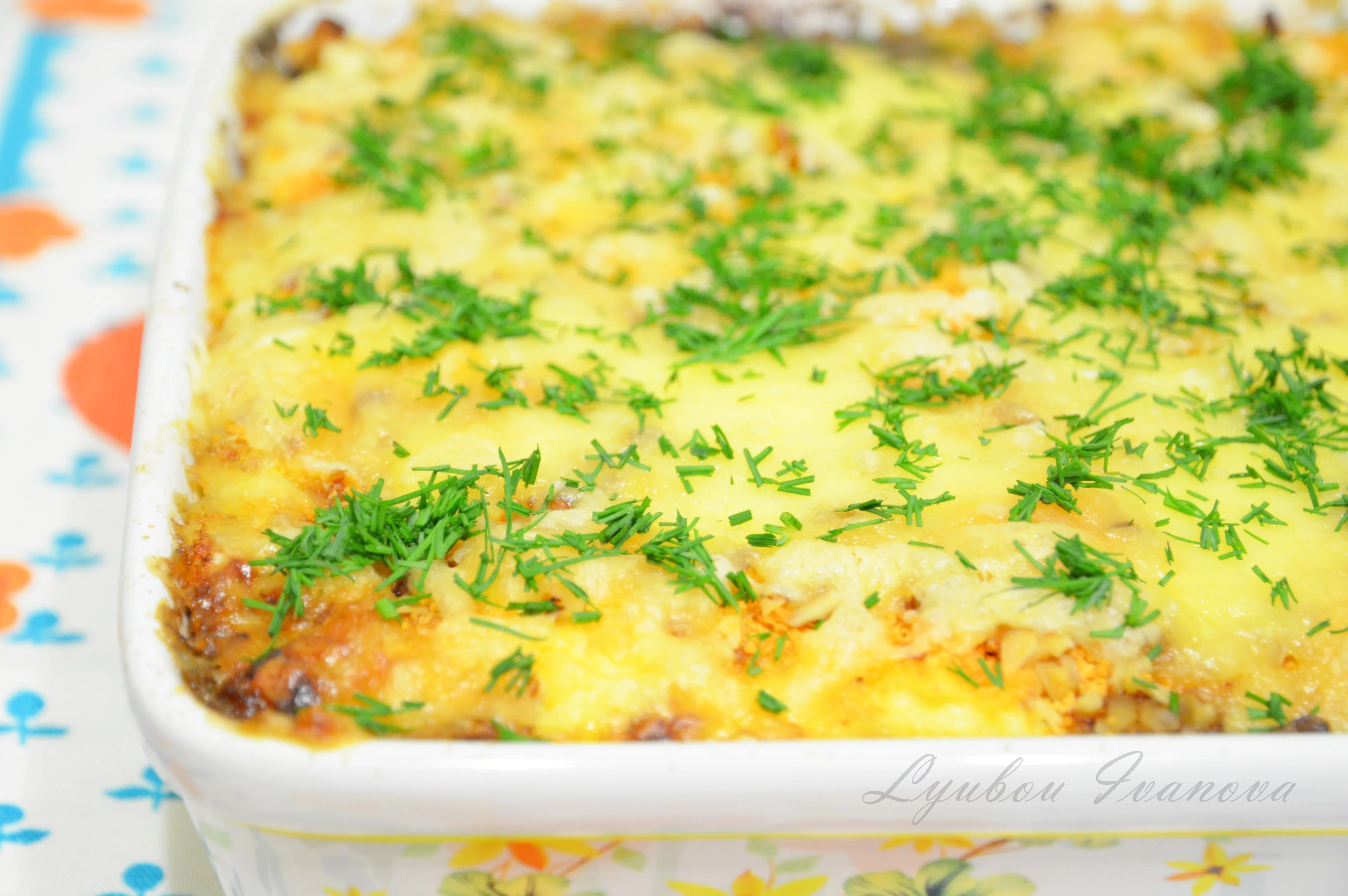 Картофельная запеканка с печенкой, тушеной в белом вине, и орехами
