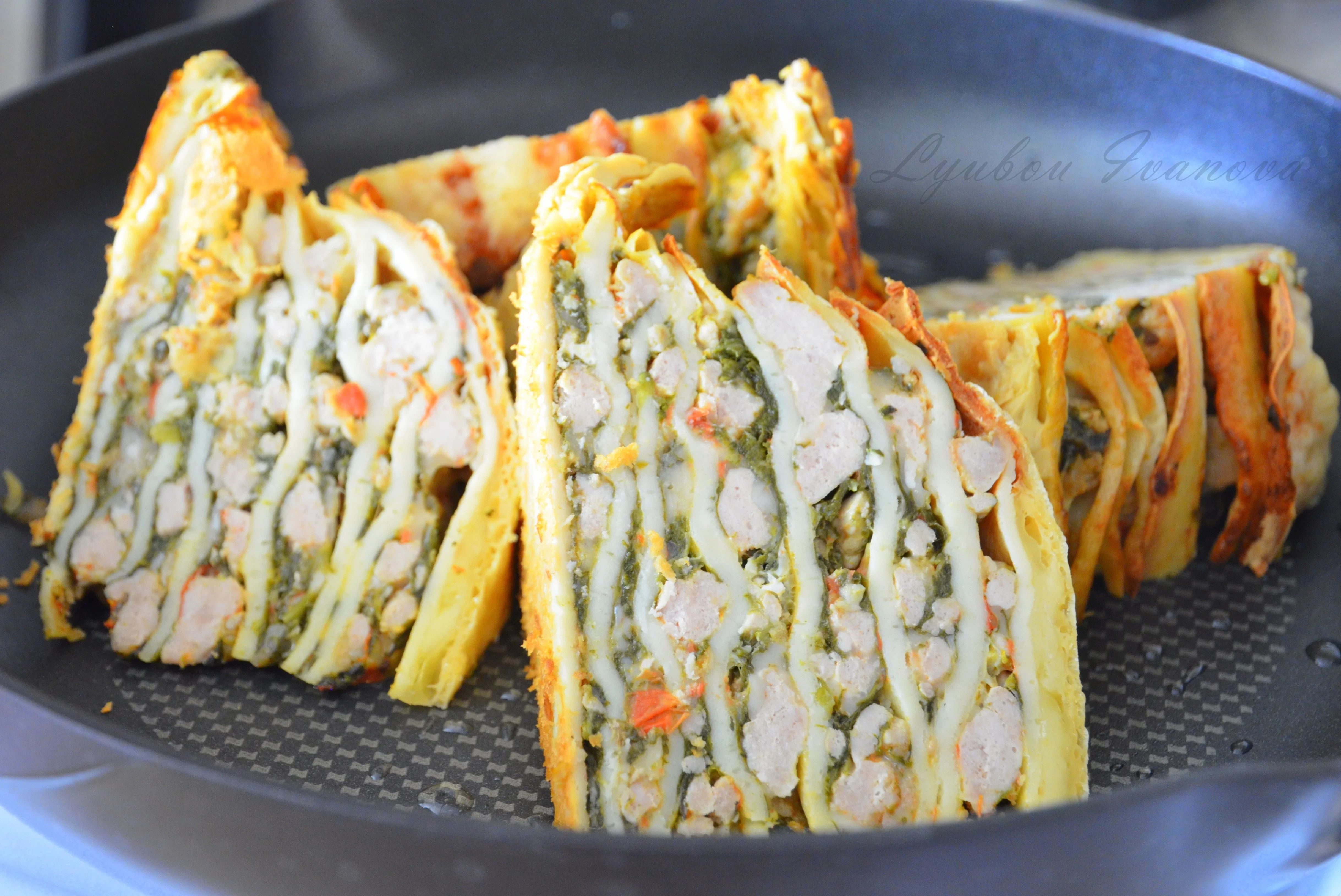 ШАГ 1 Муку соединить с молоком, добавить 2 яйца, посолить. Замесить жидкое тесто. Испечь тонкие блинчики.