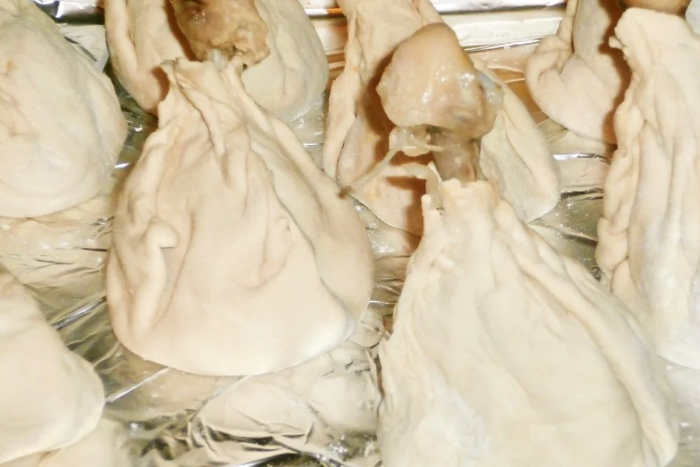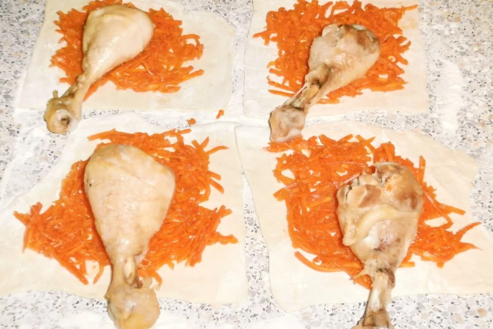 ШАГ 3 На тесто положить морковь по-корейски, сверху положить куриную ножку, защипнуть конвертиком.