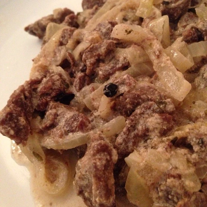 ШАГ 5 В самом конце добавить к мясу холодные сливки, обжаренный лук и потушить еще 10 минут.
