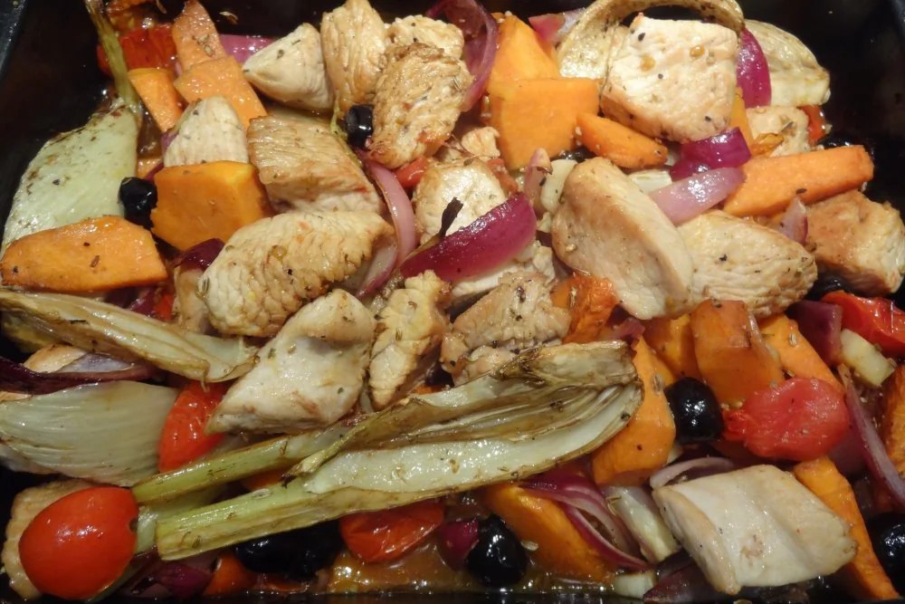 ШАГ 10 Затем добавьте индейку с чесноком и оливки, полейте сверху соком от запекания овощей и запекайте 6–8 минут, пока индейка не пропечется.