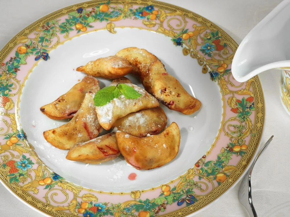 ШАГ 4 Опустить порцию вареников в разогретое масло: вынуть шумовкой через три-четыре минуты, когда они станут золотистыми, положить в тарелку. Посыпать сахарной пудрой.