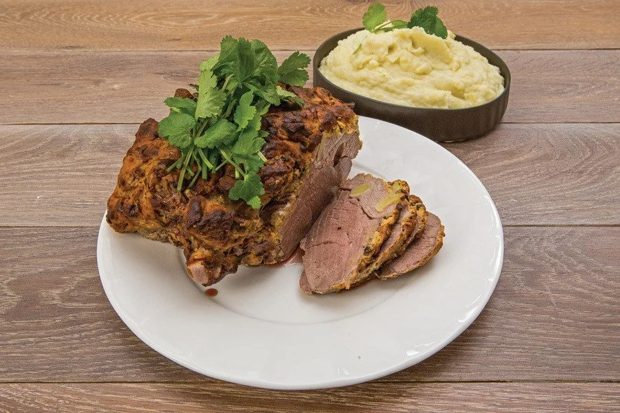 Баранья нога, запеченная в панировке из горчицы и ароматных трав, с картофельным пюре