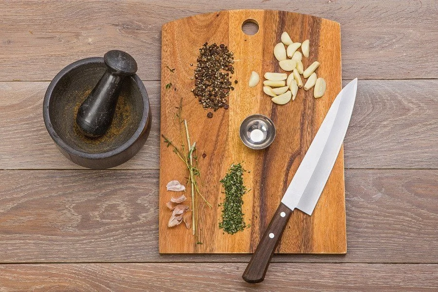ШАГ 1 Раздавите, очистите чеснок, зубчики разрежьте вдоль, раздавите перец горошком плоскостью ножа, разотрите зиру в ступке или мелко нарубите ее ножом, отделите листочки тимьяна и розмарина от стеблей, порубите листья мелко.