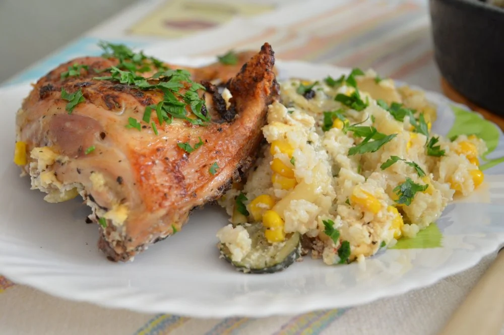 ШАГ 2 Окорочка предварительно обжарить до полуготовности в небольшом количестве растительного масла. В форму, смазанную маслом, выложить промытый рис и замороженные овощи, перемешать. На смесь уложить окорочка.