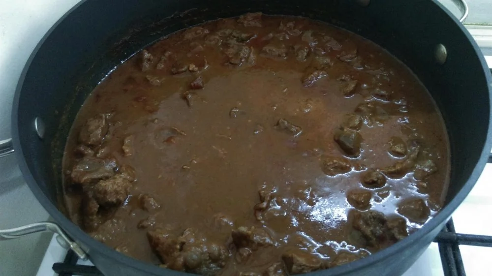 ШАГ 7 Добавляем мясо. Готовим, не накрывая крышкой, около 1–1,5 часа, пока мясо не станет мягкое и нежное.