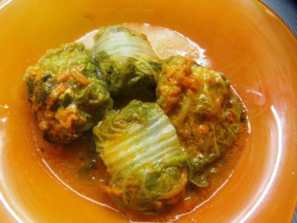 ШАГ 1 Пекинскую капусту разобрать на листочки. Нижнюю жесткую часть листа отрезать, оставить только верхнюю половинку. В большой кастрюле вскипятить воду, опустить листы капусты в кипяток на 1–2 минуты, не больше. Достать листы шумовкой и сразу переложить их в чашку с холодной водой. Как только они остынут, воду слить и обсушить капустные листья бумажными полотенцами.