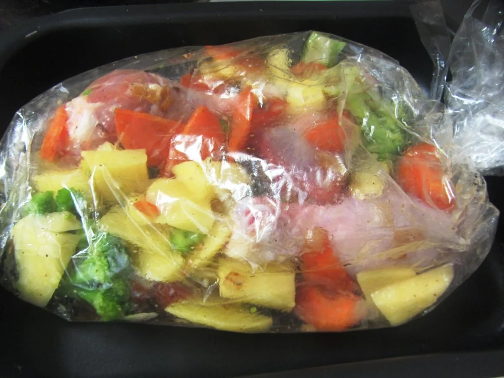 ШАГ 4 Засыпаем туда то овощи, то складываем куриное филе. Не забываем перчить по вкусу. Потрясываем рукав.